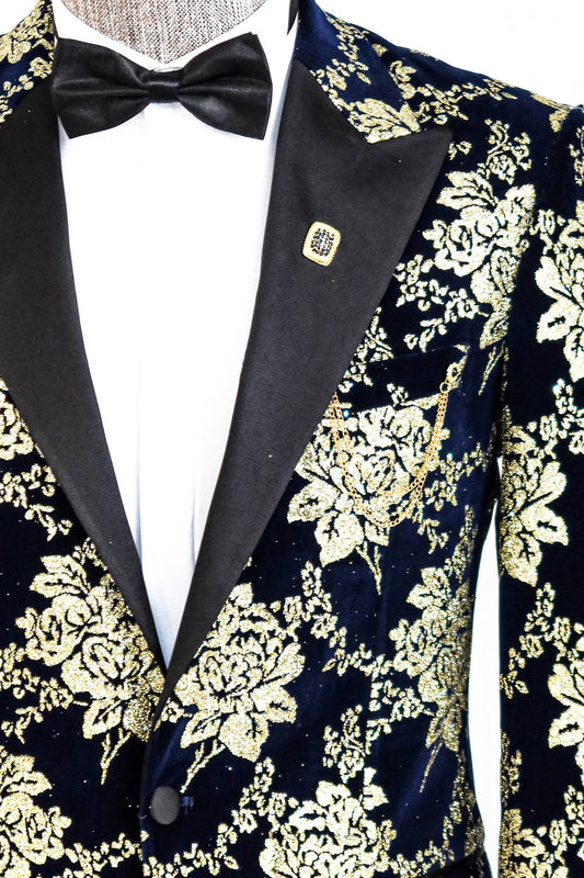 Gold Floral Patterned Navy Blue Men Party Blazer -