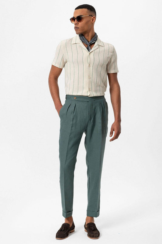 Men's Green Collar Button Detail 100% Linen Shirt -