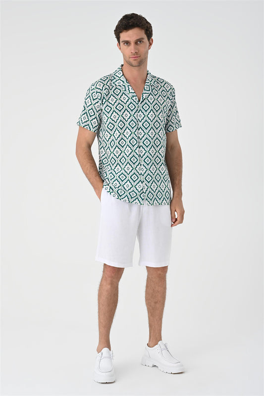 Men's Green Ethnic Pattern Open Collar Short Sleeve Shirt