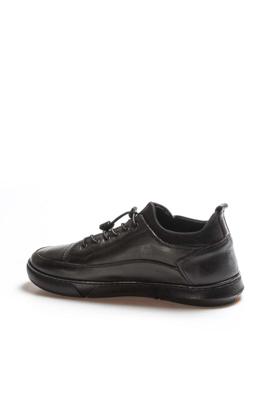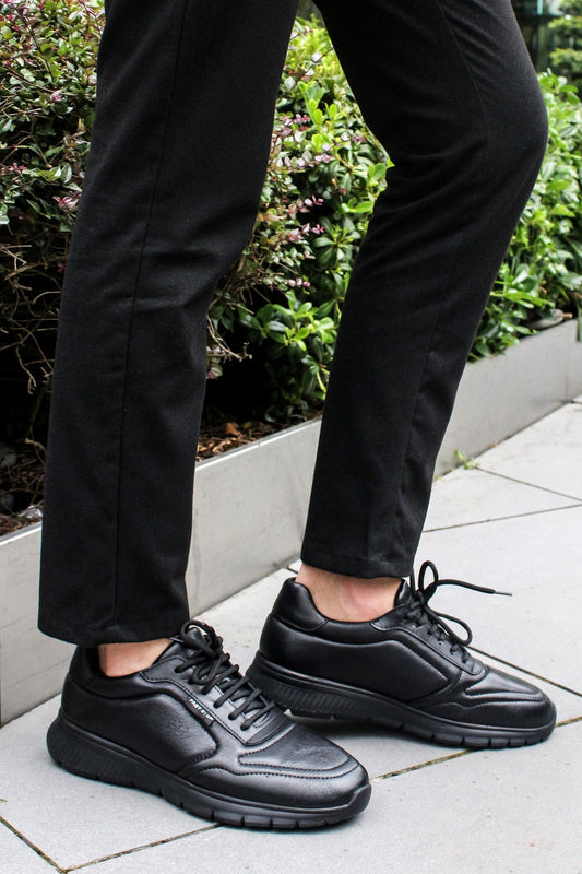 Men's Black Leather Sneakers with Padded Collar and Cushioned Sole
