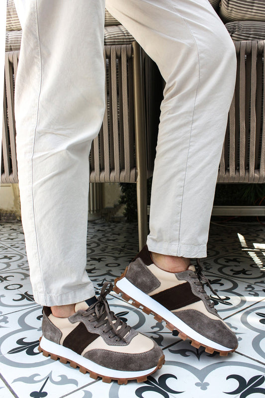 Men's Beige and Grey Suede Casual Sneakers with Brown and Navy Accents