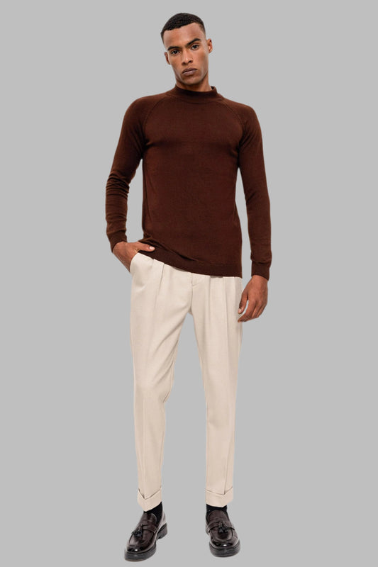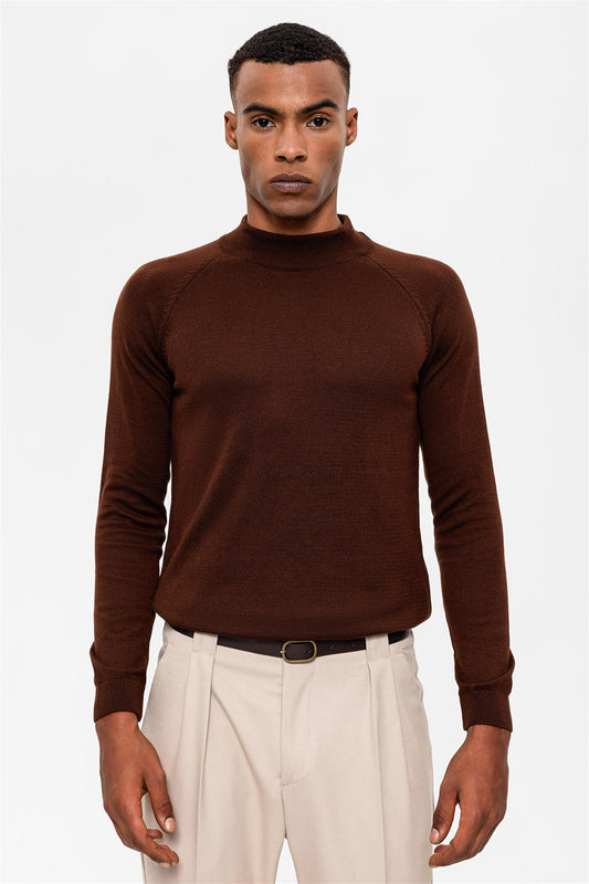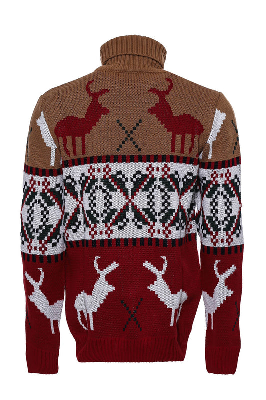 Deer Patterned Christmas Themed Turtleneck Red Beige Men Sweater