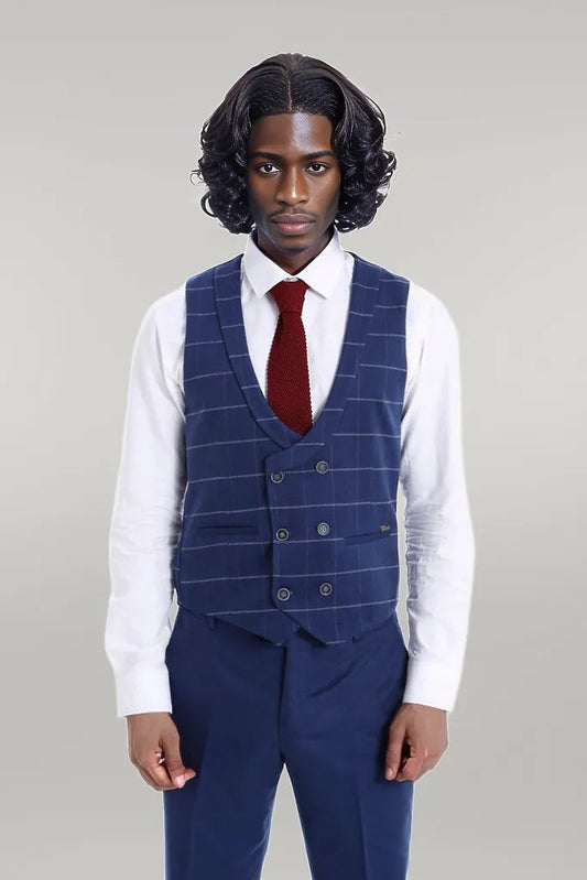 Plaid Collared Double Breasted Navy Blue Men Vest