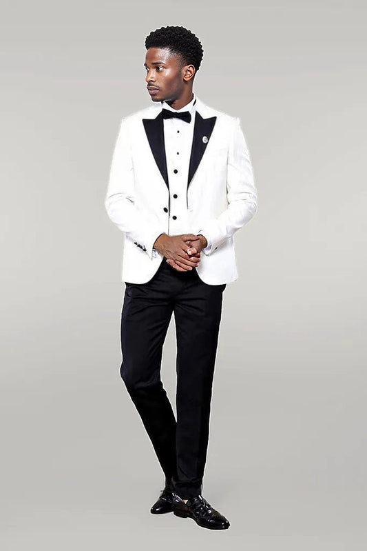 3 Piece White Men’s Tuxedo with Black Satin Lapel and Rhinestone Embellishments – Wessi