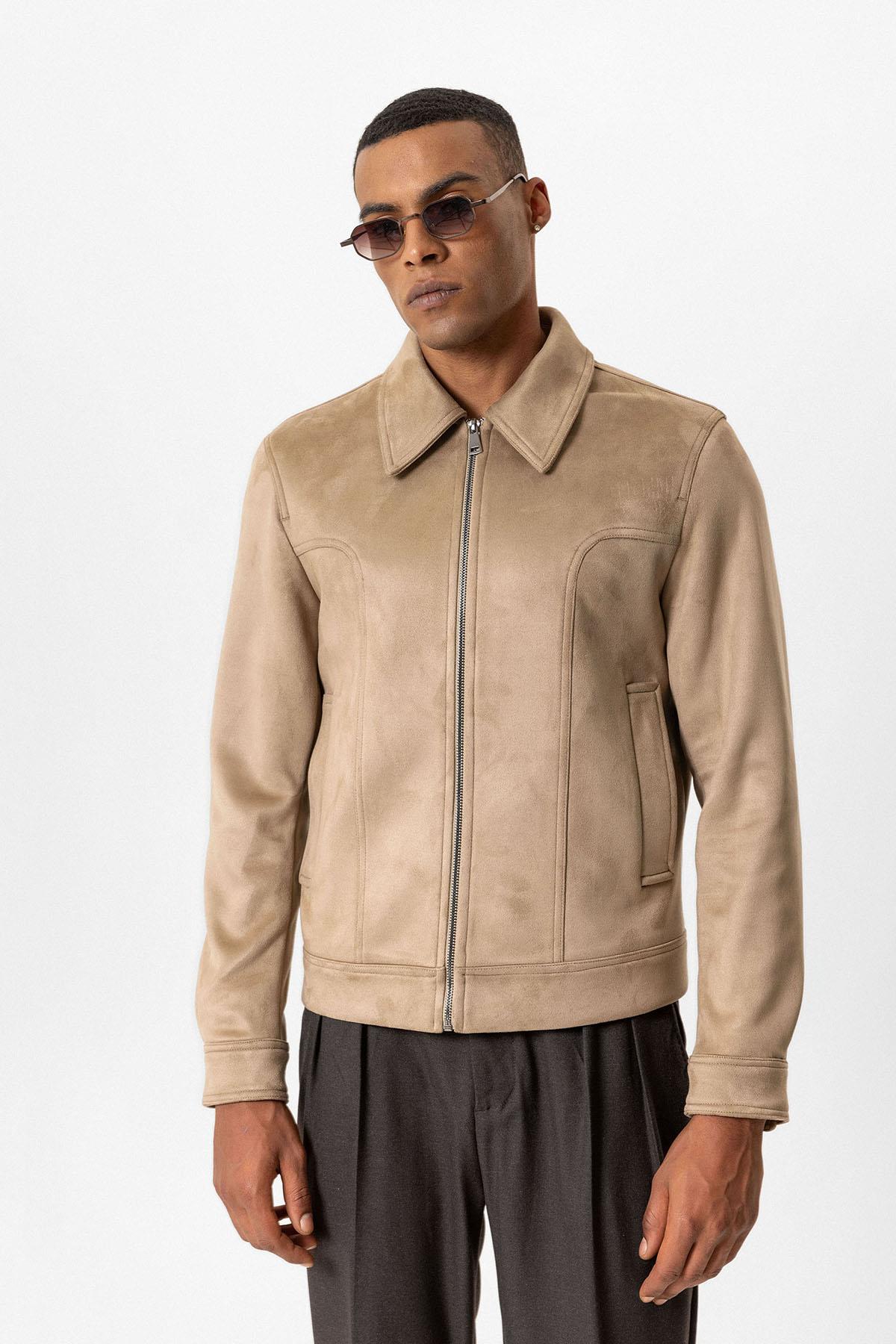 Beige Crop Fit Suede Men's Jackets