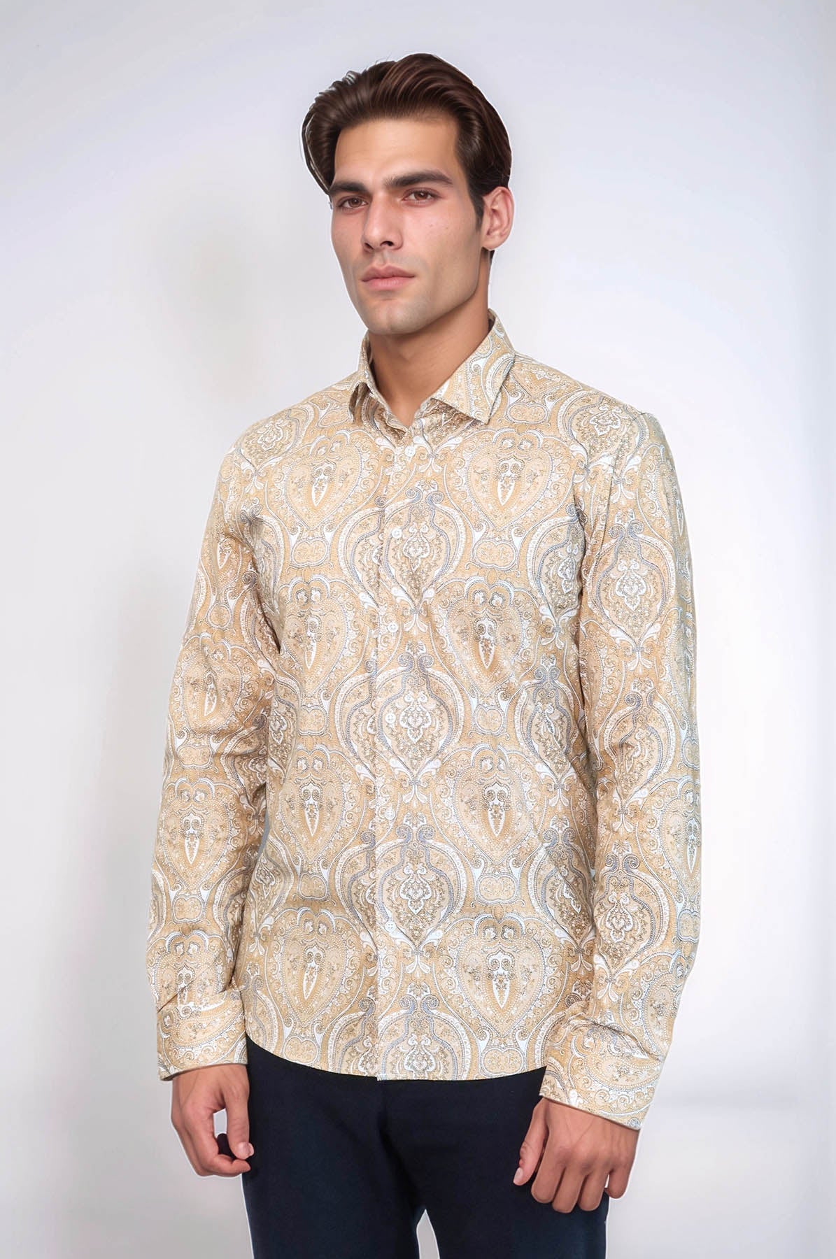 Beige Patterned Slim Fit Men's Shirt