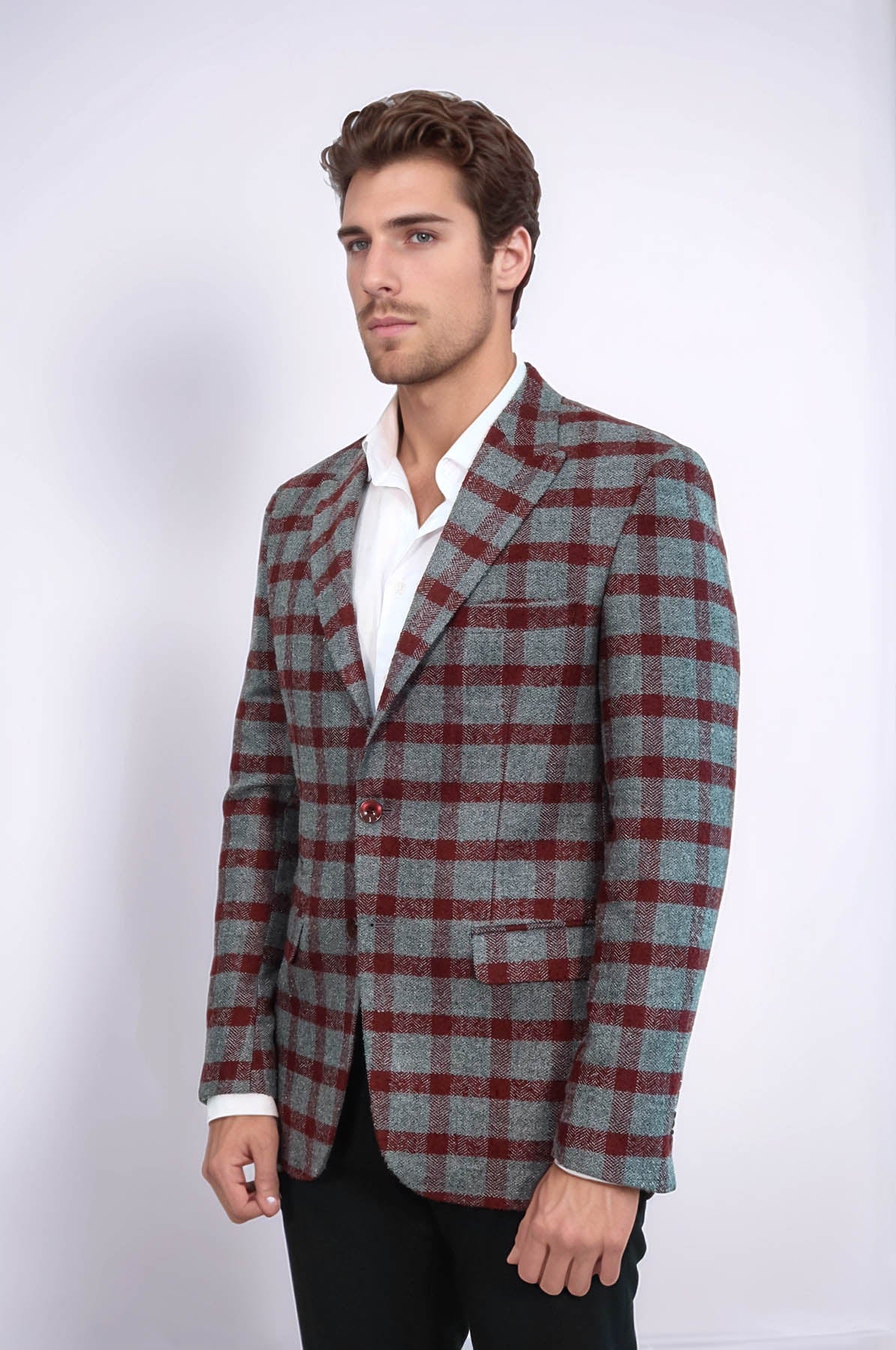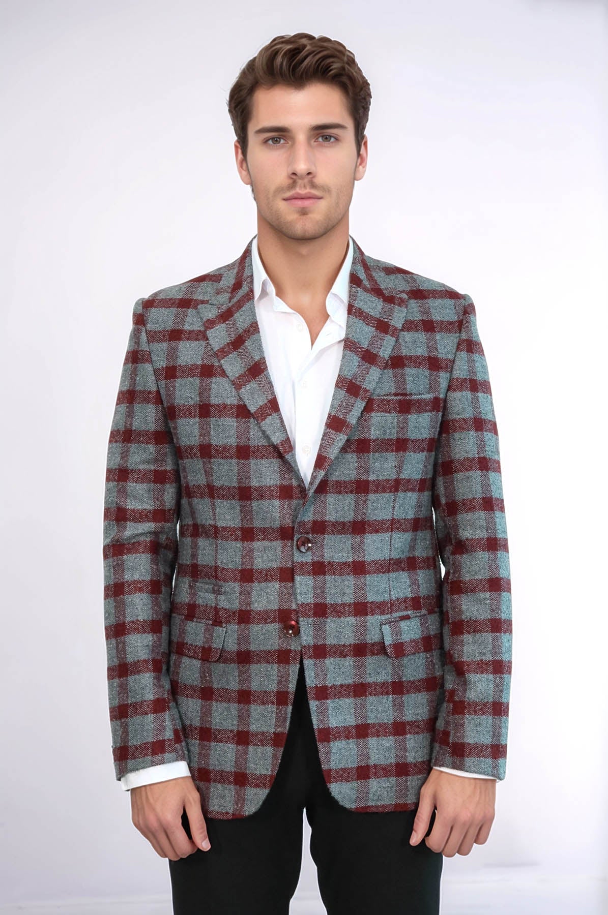 Checked Peak Lapel Slim-Fit Burgundy Men...