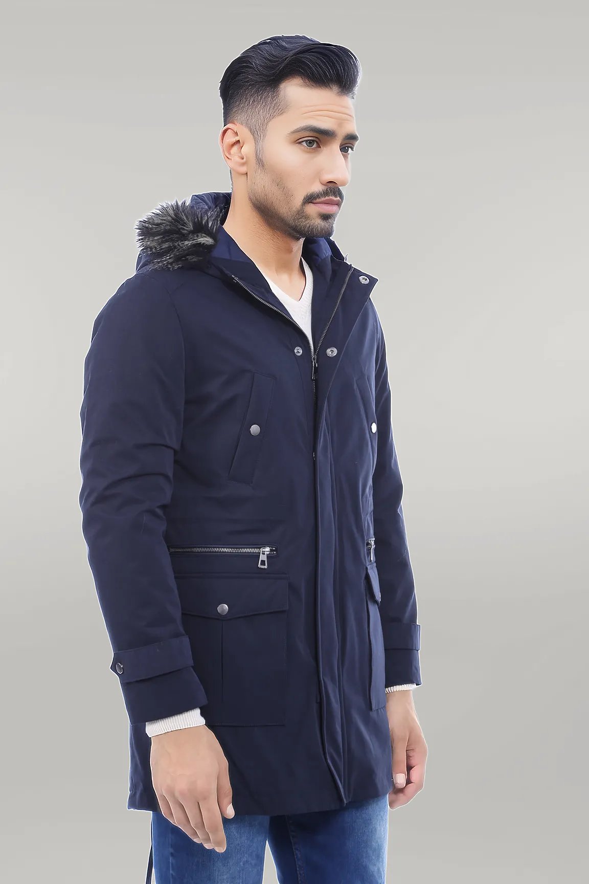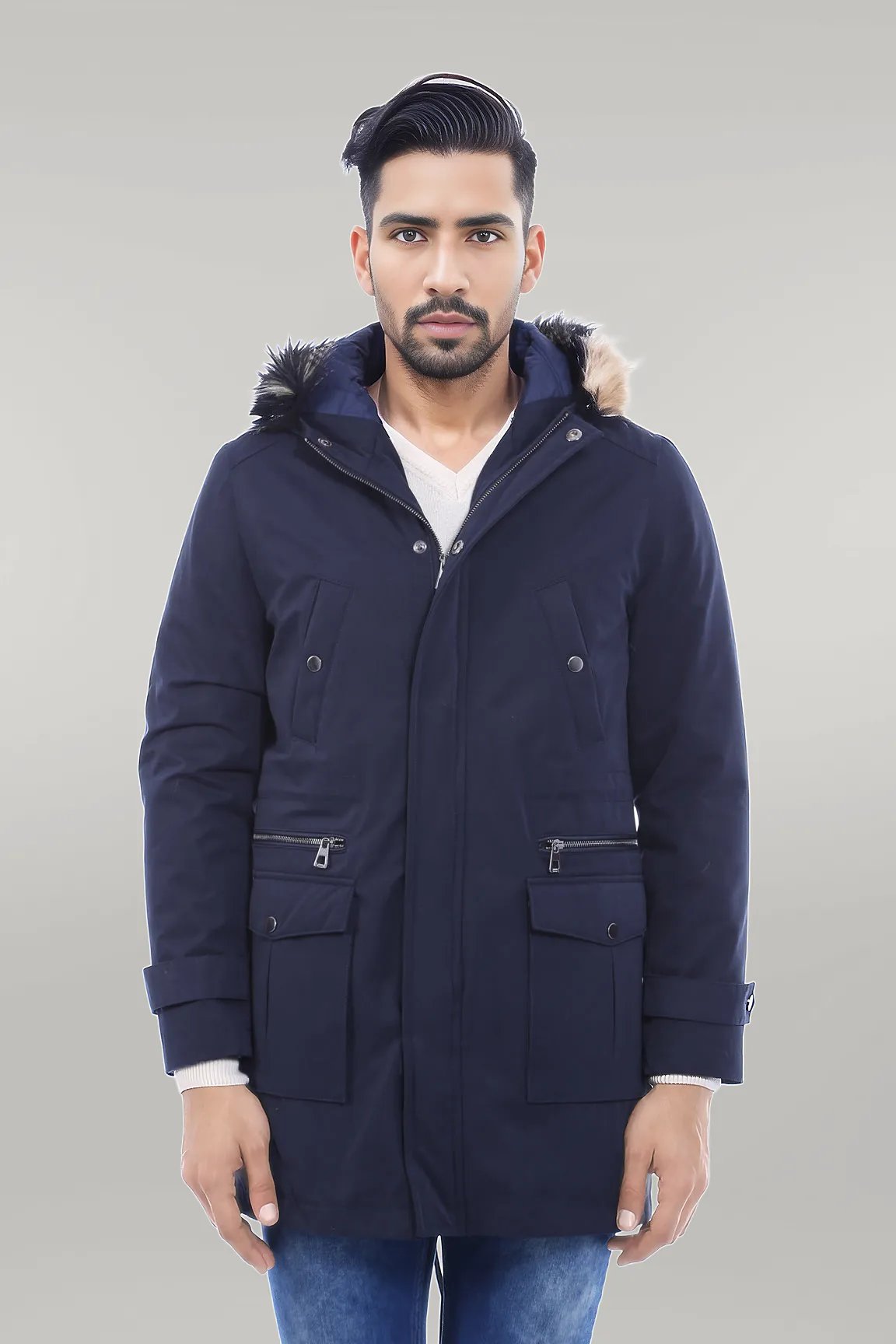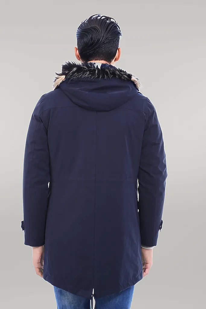 Fur Hooded Navy Blue Men Coat