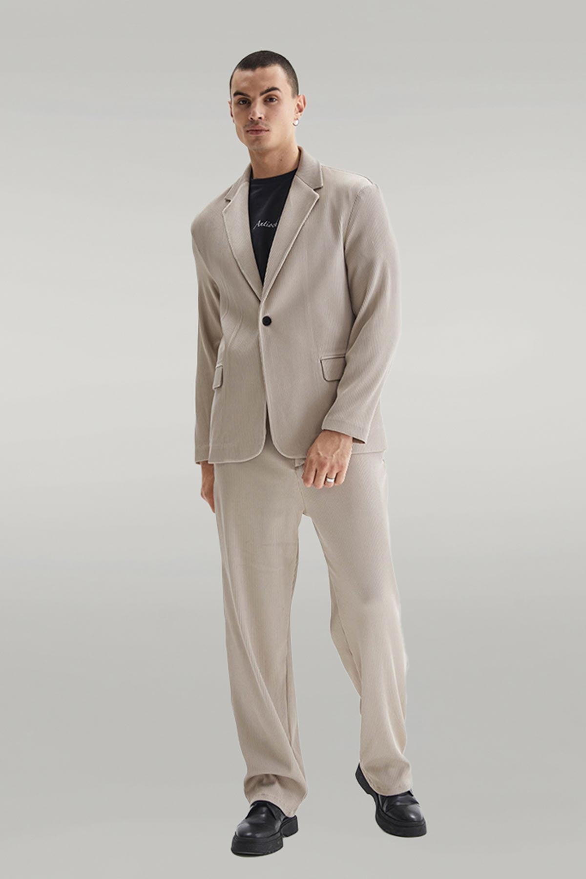 Men's Beige Ribbed Textured Oversize Suit