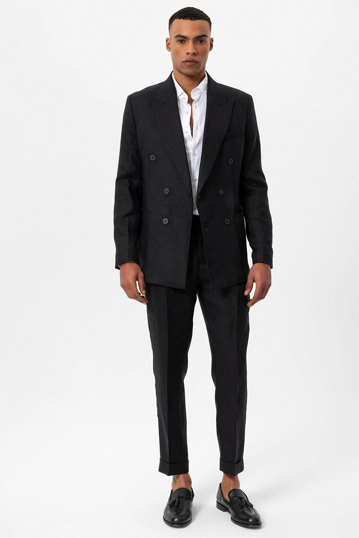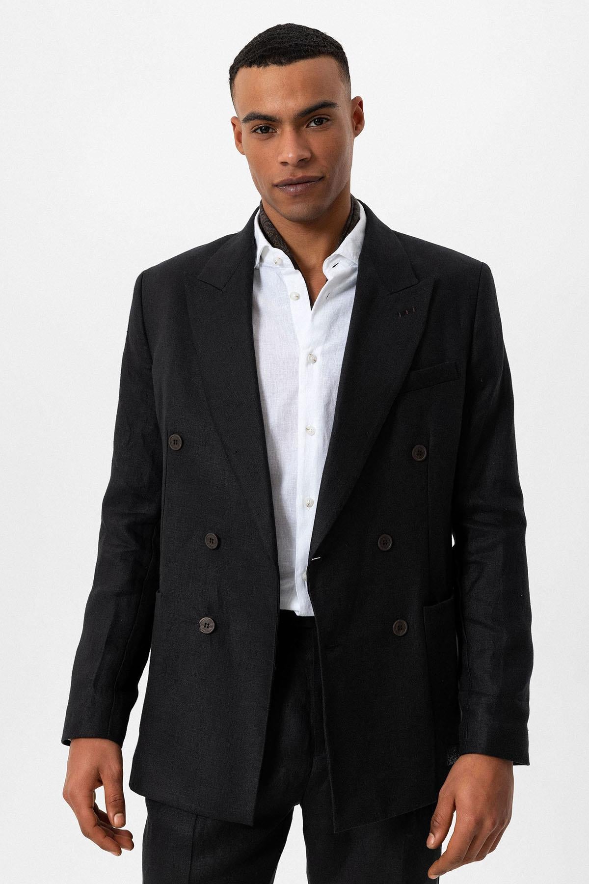 Men's Black 100% Linen Double-Breasted Blazer