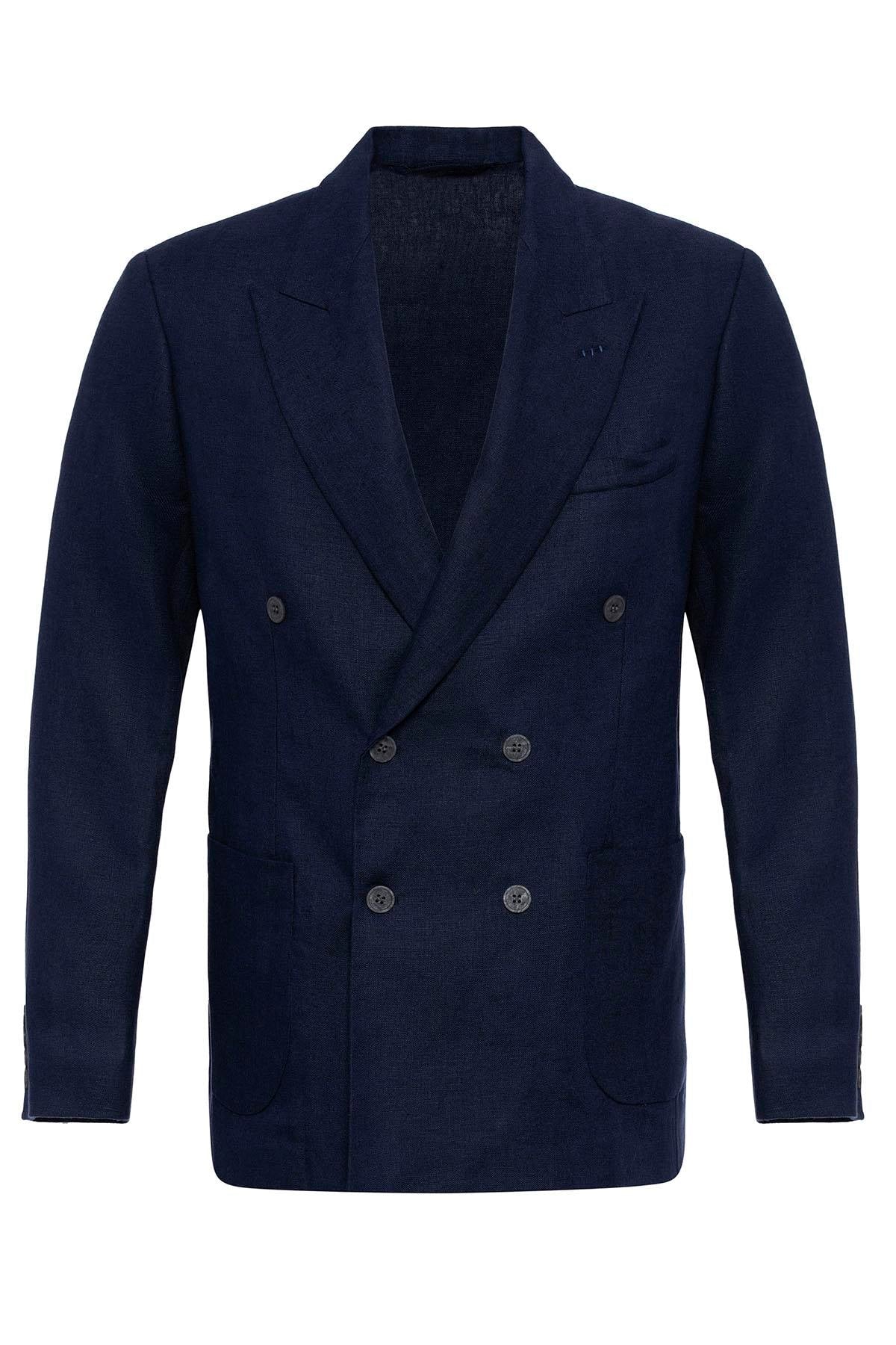 Men's Navy Blue 100% Linen Double-Breasted...