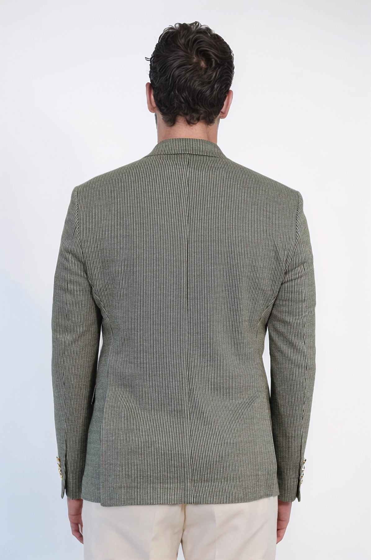 Olive Green Pinstriped Slim Fit Double-Breasted...