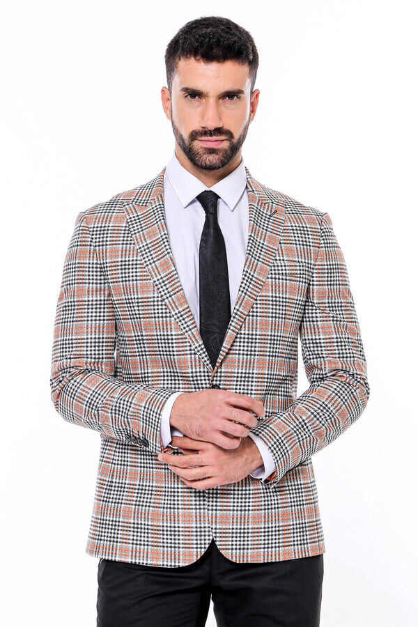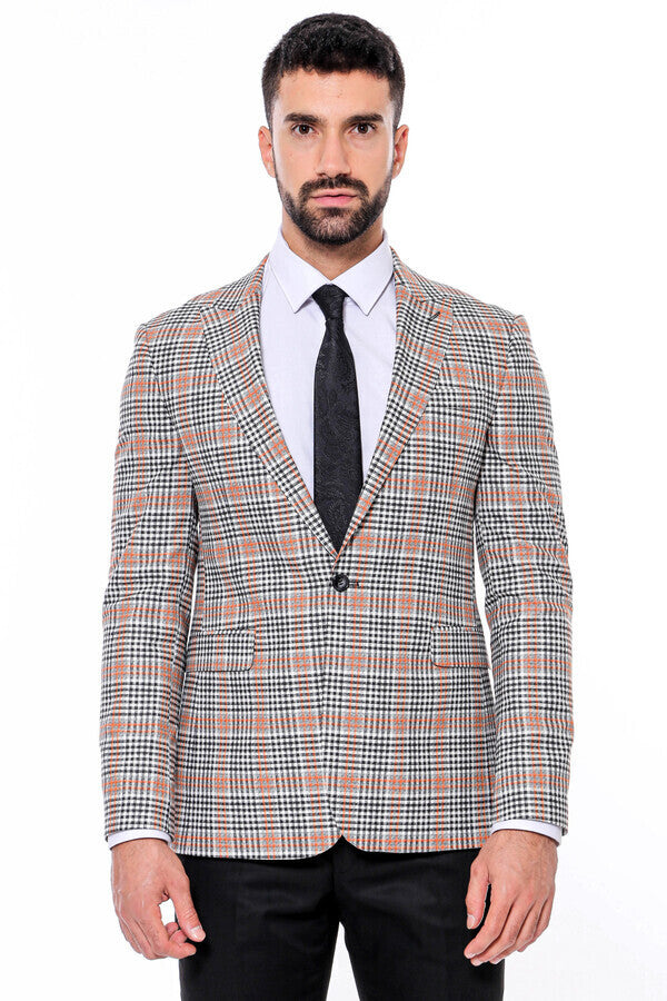 Plaid Slim-Fit Orange Black Men Blazer