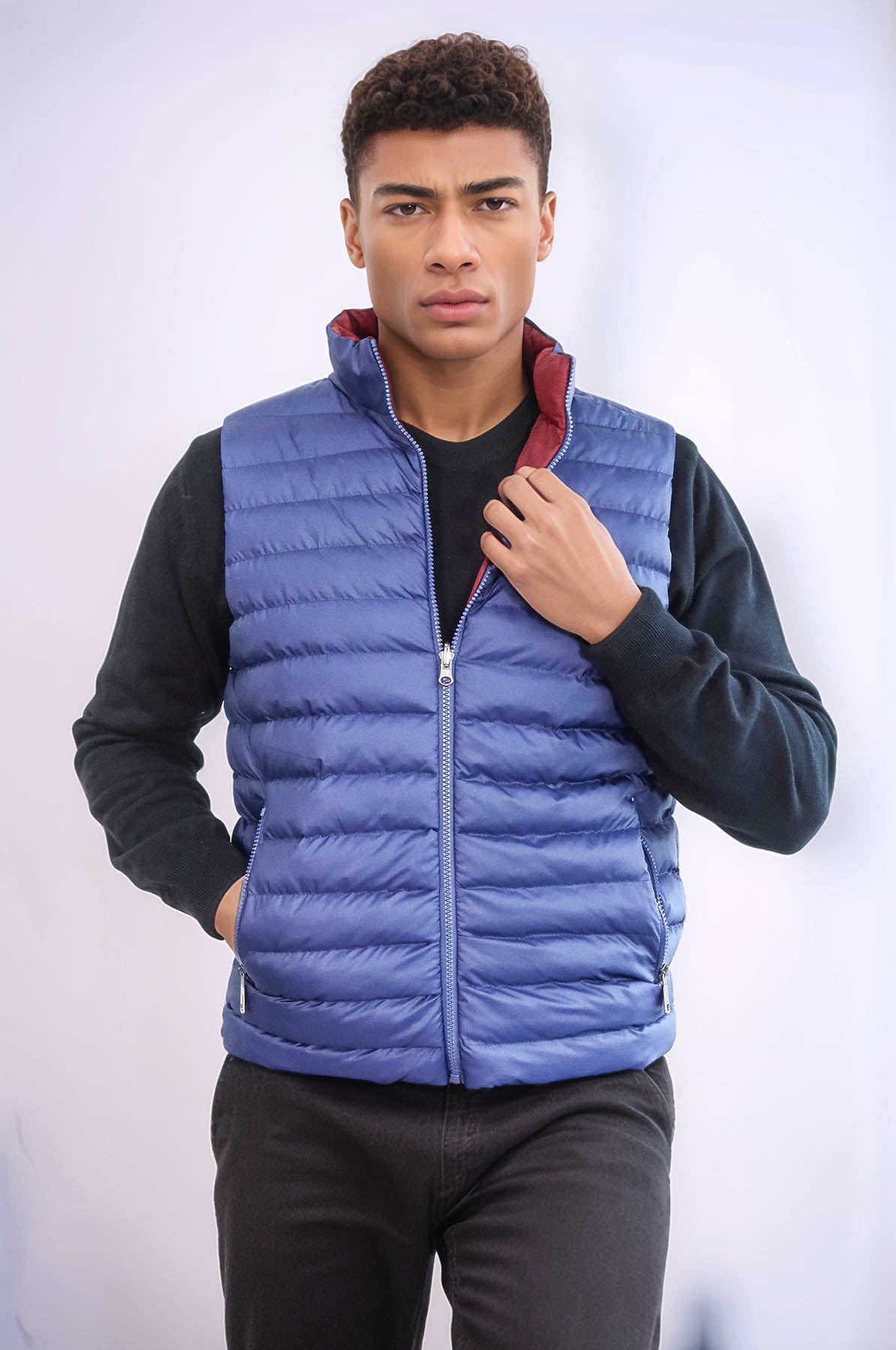 Reversible Quilted Standing Collar Indigo Blue...