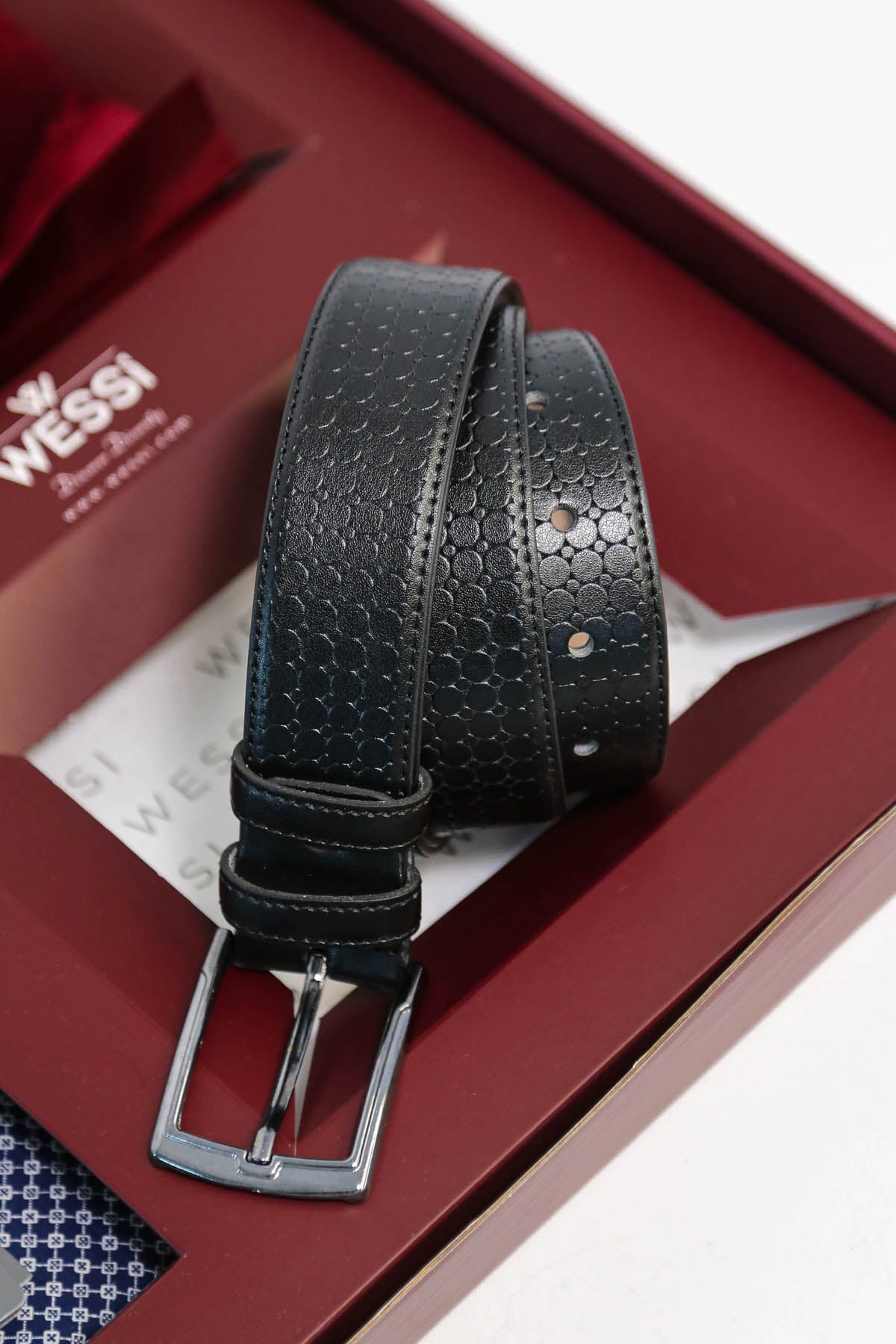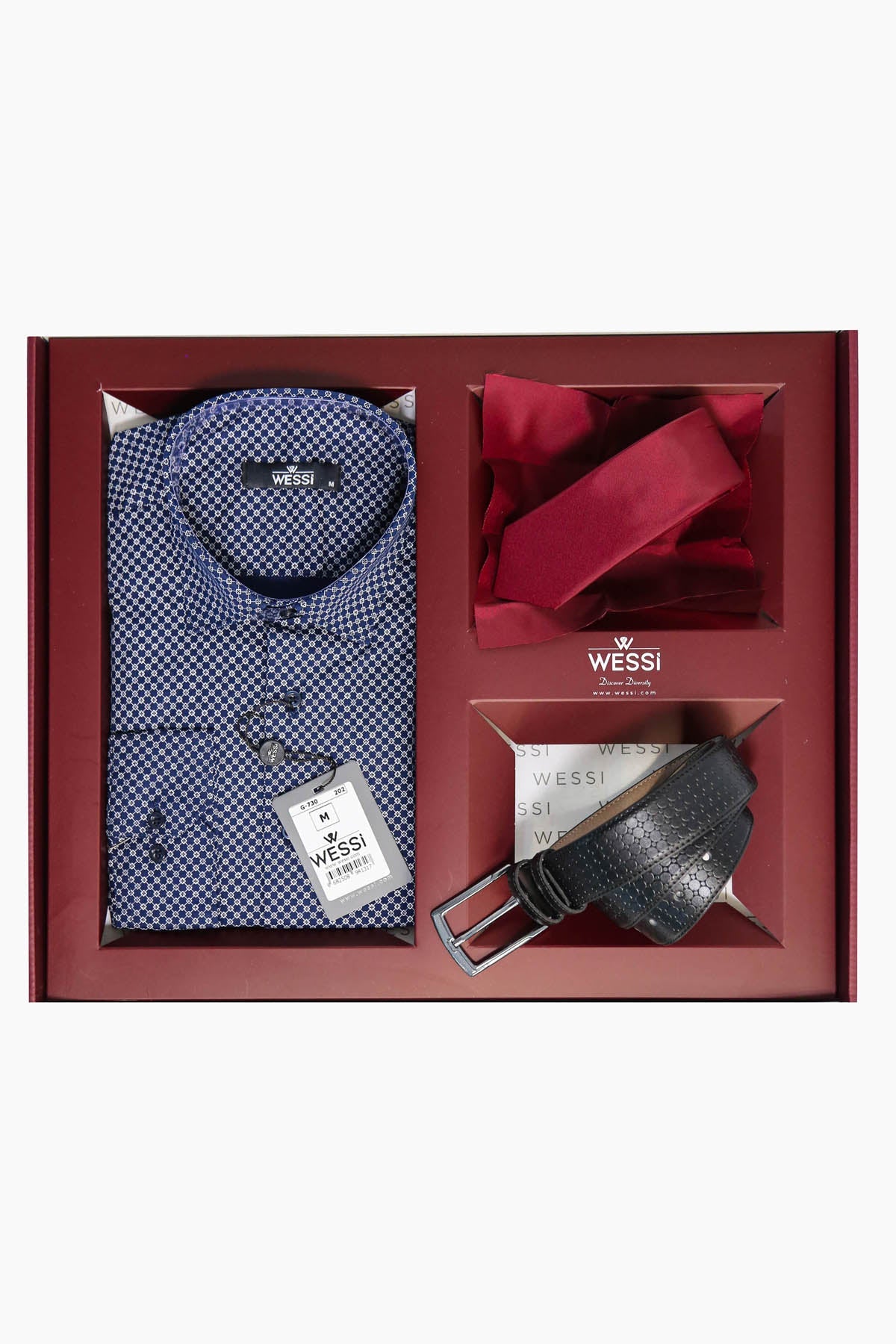 The Dapper Gift Box by Wessi – Includes Blue Tiny-Check Shirt, Burgundy Tie; Black Textured Belt