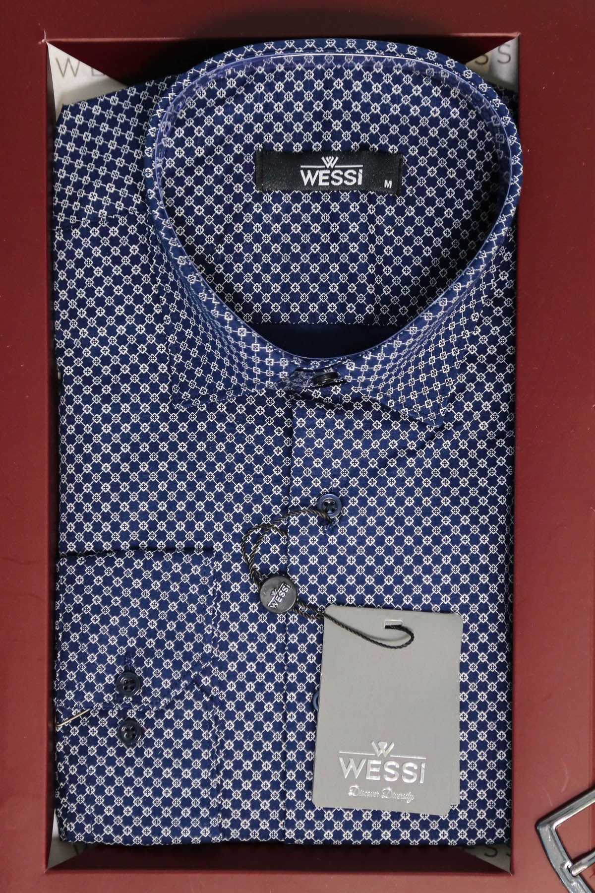 • A striking navy geometric-pattern shirt, crafted with fine details and a flattering fit — ideal for both business and special occasions.