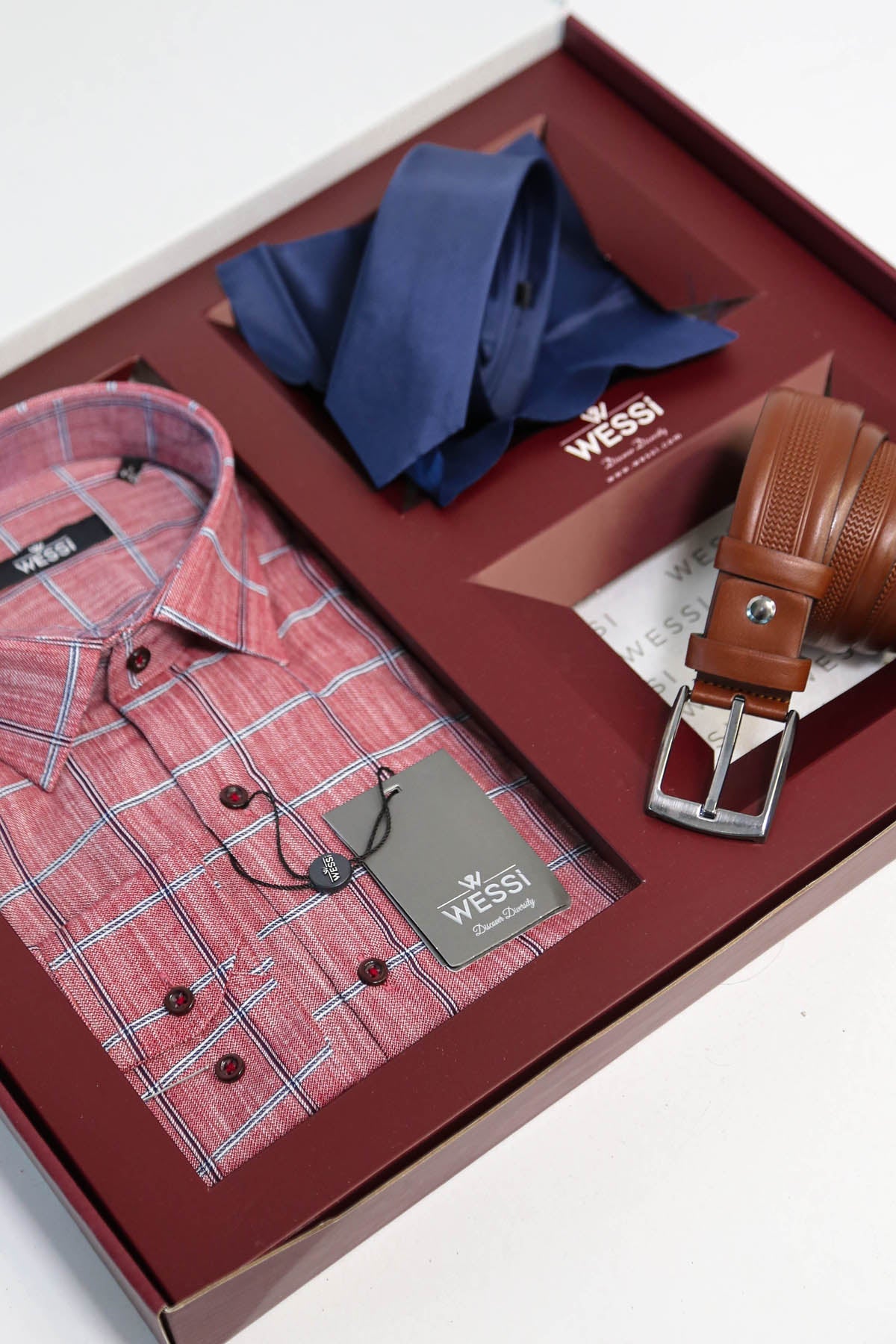 The Dapper Gift Box by Wessi – Includes Burgundy Plaid Shirt, Navy Tie & Tan Textured Belt