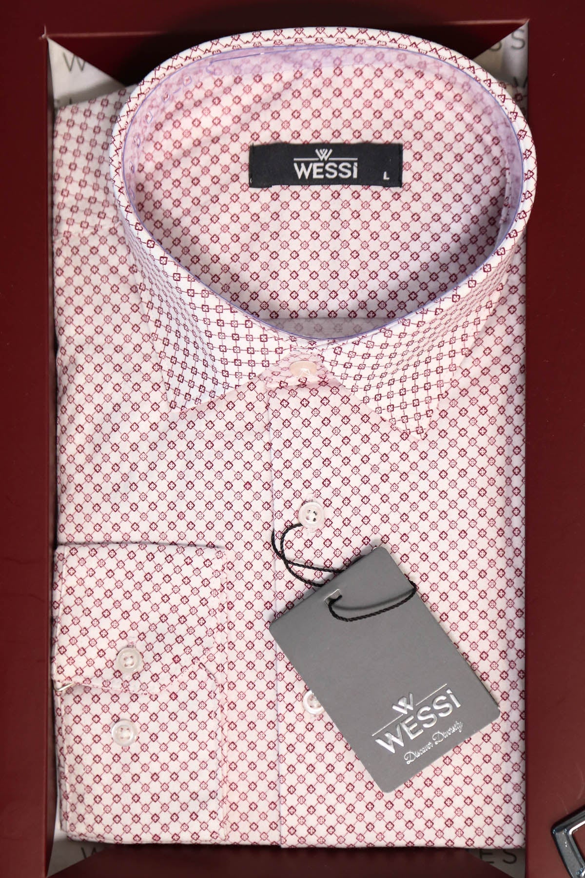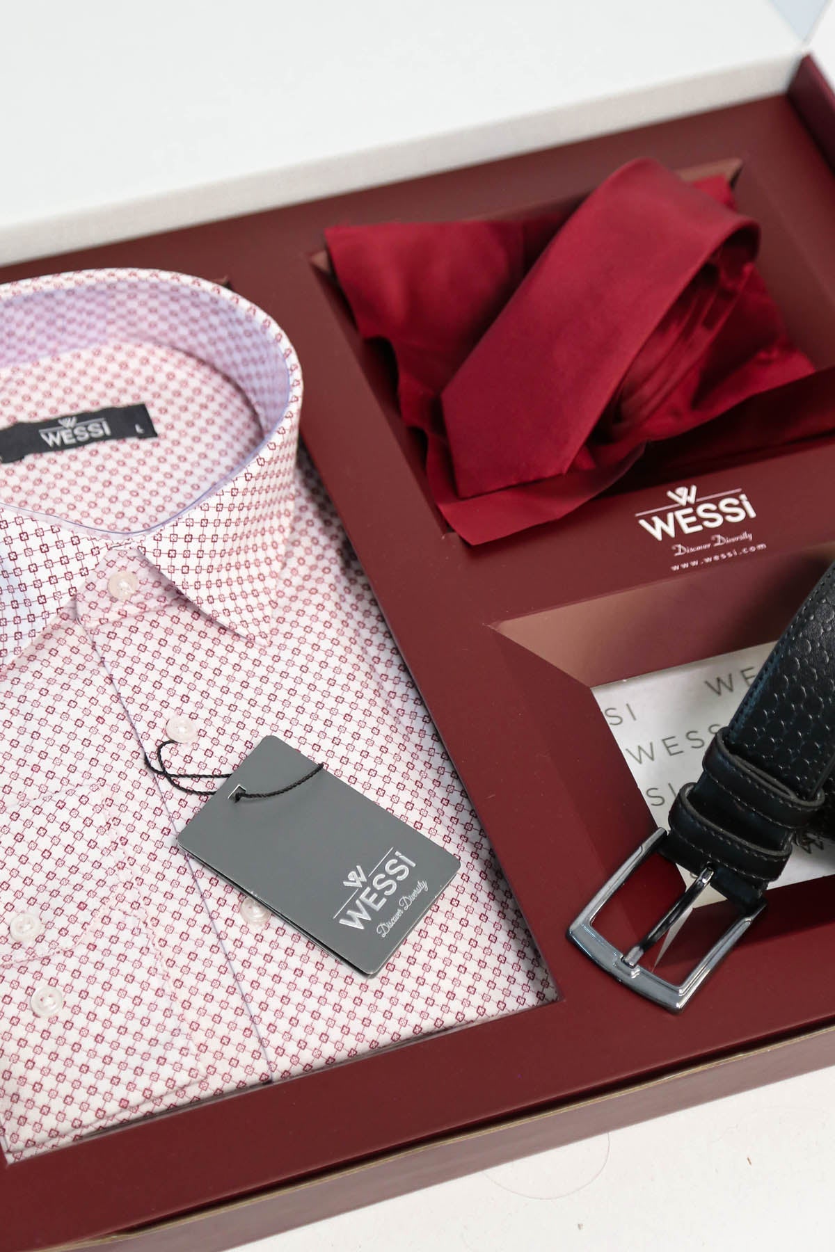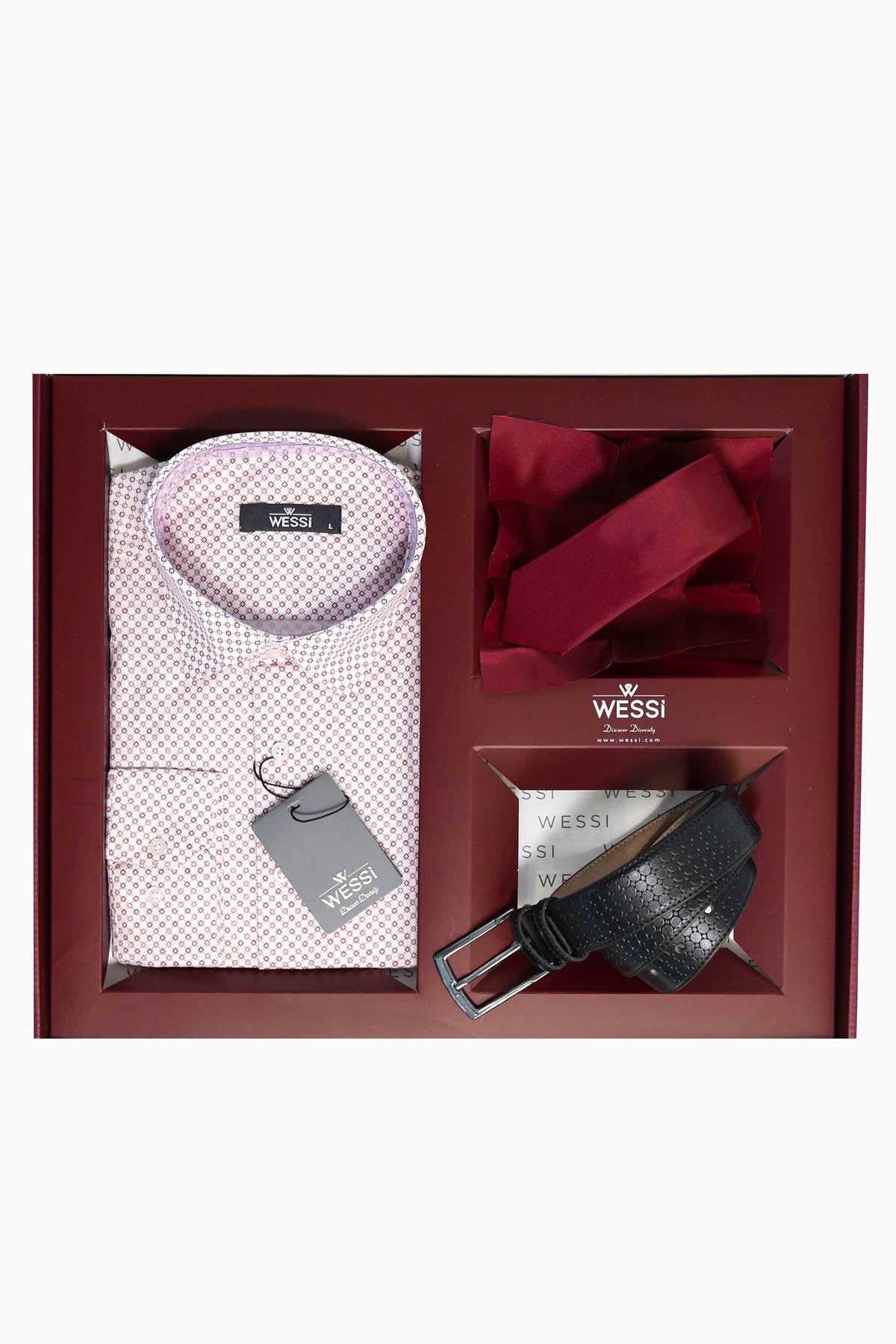 The Dapper Gift Box by Wessi – Includes Light Pink Geometric Shirt, Burgundy Tie & Textured Black Belt