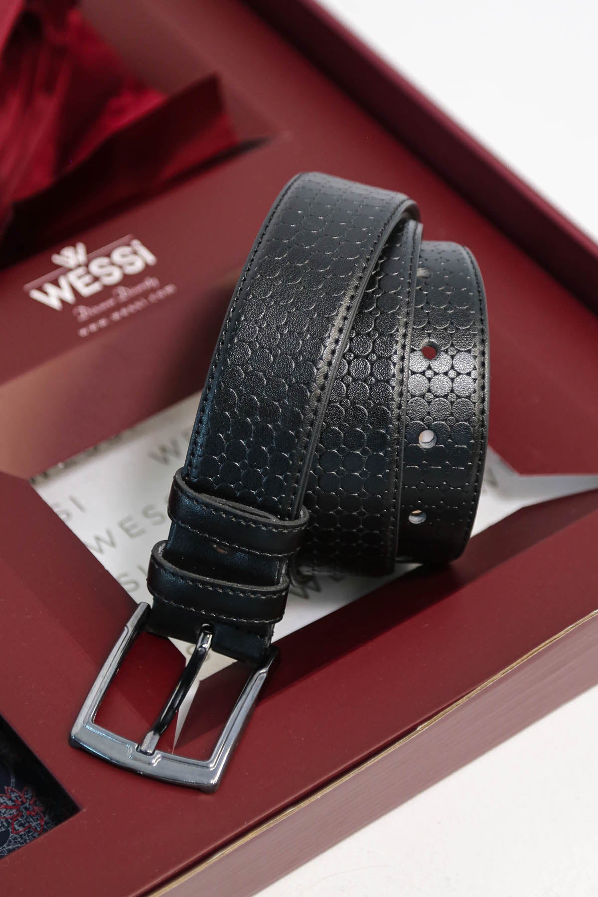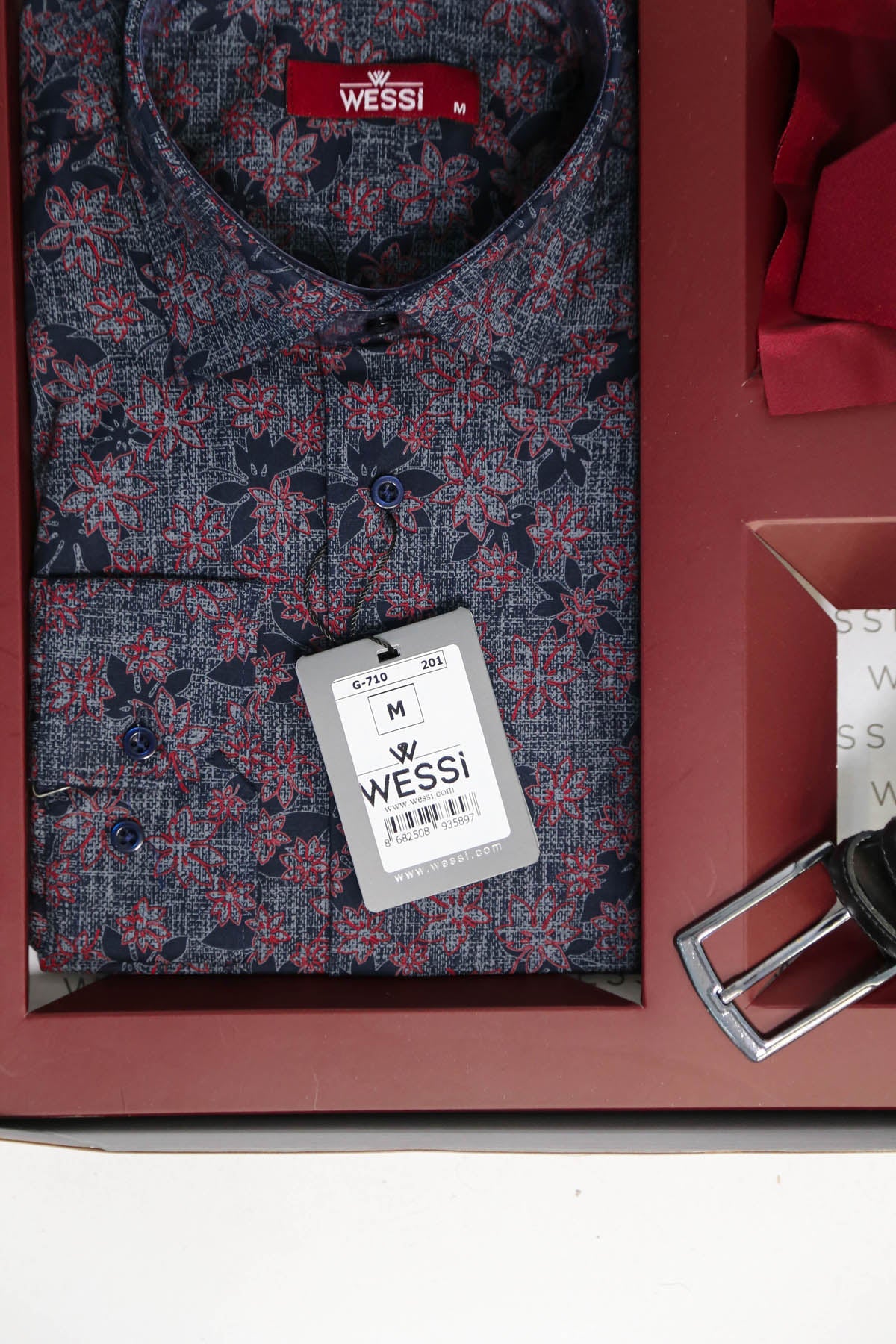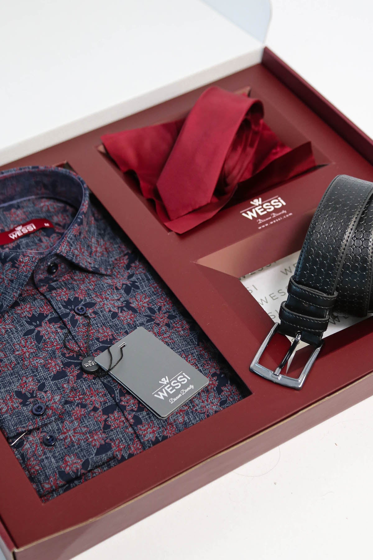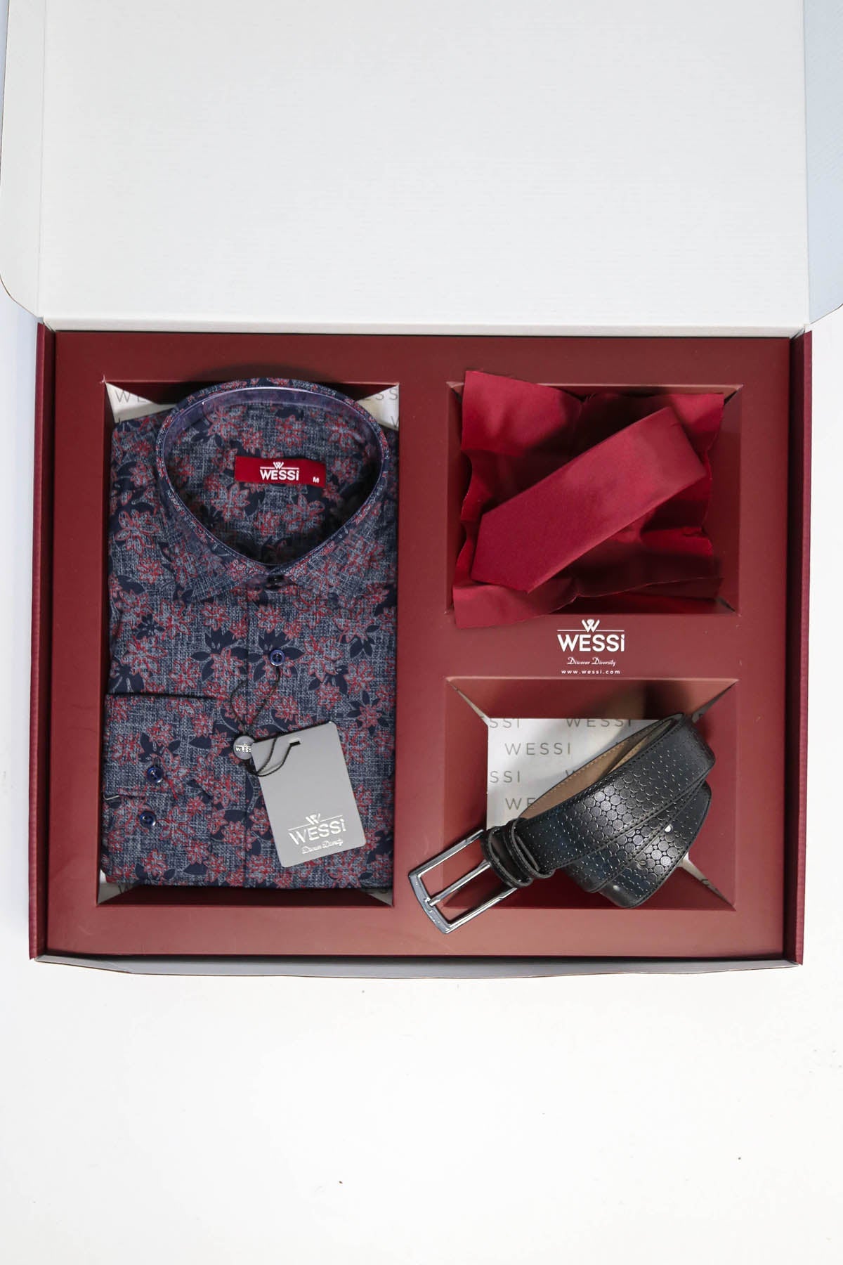 The Dapper Gift Box by Wessi – Includes Navy Floral Shirt, Burgundy Tie & Black Textured Belt