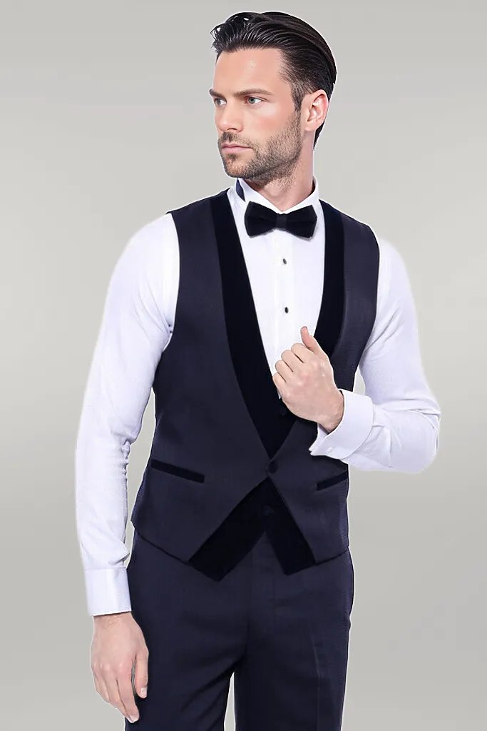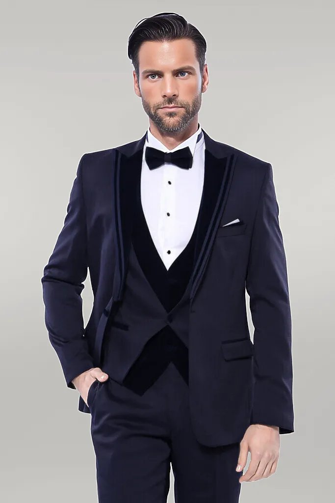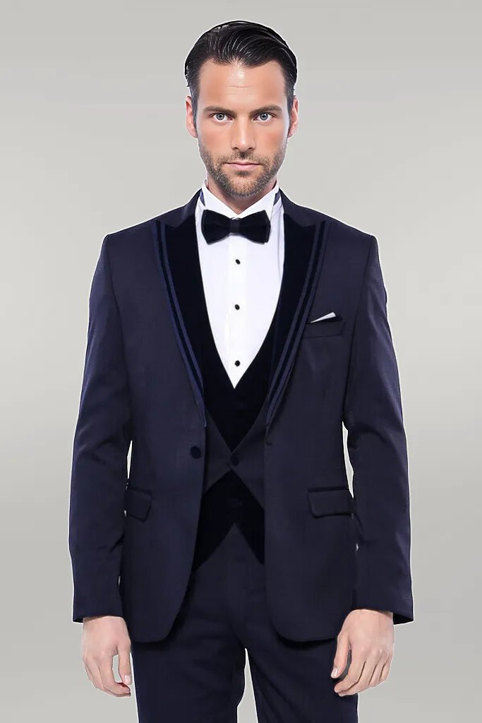 Velvet Collar Patterned Dark Blue Tuxedo