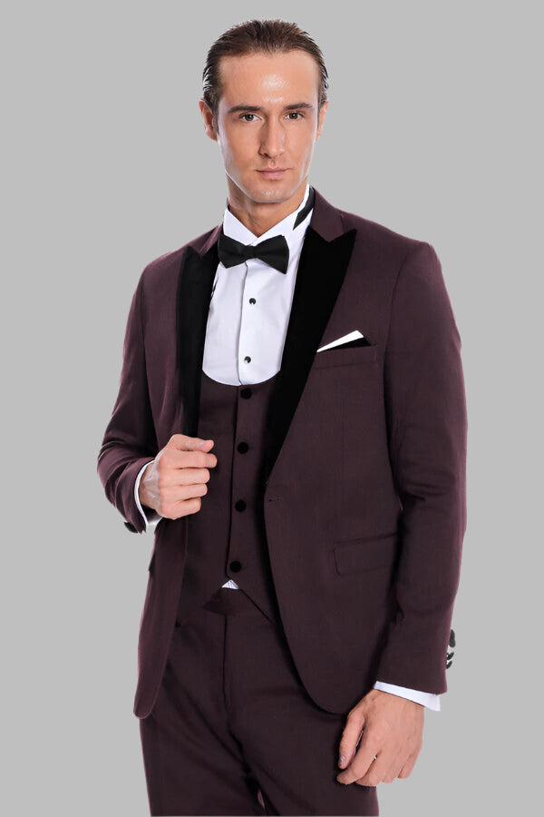 Velvet Lapel Slim Fit Burgundy Men...